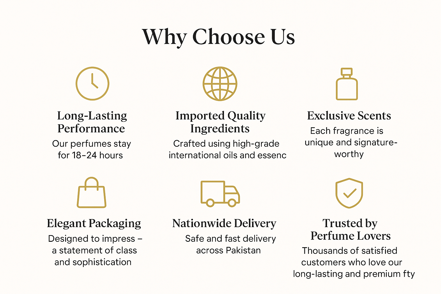 Our perfumes last 18–24 hours, depending on skin type and weather.